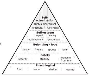 According to Maslow’s Hierarchy of Needs, which was created in 1954, every being has five major Need Categories that keeps them alive and makes them feel whole. According to his theory, one cannot reach the next level until they have fully (or almost fully) satisfied the phases before it. The first need is the Physiological need, which includes health, food, and sleep. The second need is the Safety need, which includes shelter and removal from danger. The third need is the Belonging need, which includes love, affection, and being apart of groups. The fourth need is Esteem, which includes self-esteem and esteem for others. And the fifth and final stage is Self Actualization, where a person feels as though they have achieved their individual potential.